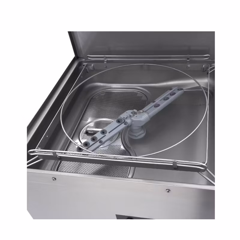 Med en låg ljudnivå på under 65 dB och en vattenförbrukning på endast 2,8 liter per cykel är maskinen både tyst och resurssnål. Den är utrustad med en IPX4-skyddad kontrollpanel som förhindrar intrång av vatten. Panelen har fyra lättanvända knappar för på/av, start/stop av diskcykel, programval och dräneringspump. Temperatur- och sköljindikatorer ger enkel övervakning under drift.