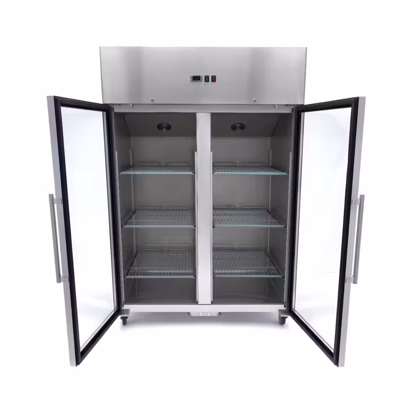 Denna professionella frys med glasdörrar har 1200 liters kapacitet, självstängande dörr, LED-lampa och sex höjdjusterbara hyllor. Med fyra hjul är den lätt att flytta till den bästa platsen i köket. Idealisk för restauranger och kommersiella kök.
